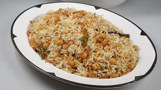 A big tray of Channa Rice, which is basmati rice cooked together with chickpeas (chana) and gentle spices. This dish combines grains and legumes, giving your guests a two-in-one combo of rice and protein in a single side. It’s a great way to offer a more flavorful alternative to plain rice, and it pairs wonderfully with our curry trays in the buffet.