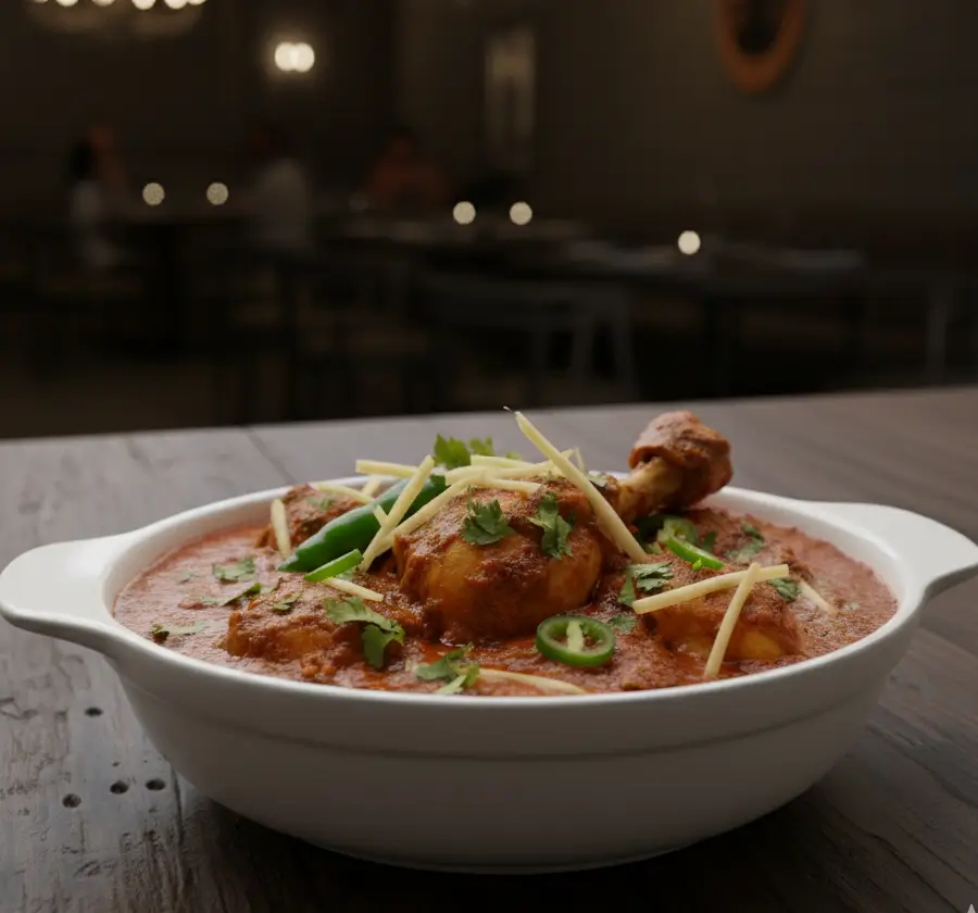 A large tray of Chicken Karahi, a signature Pakistani curry where chicken is cooked in a wok-like karahi with tomatoes and a bold blend of spices. This catering-sized portion delivers tangy, spicy chicken curry to satisfy a crowd, and it goes perfectly with our naan or rice on the side.